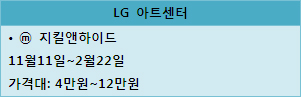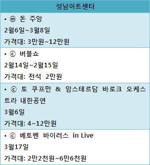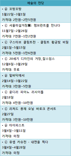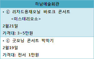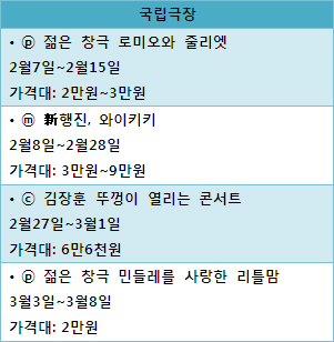 URL복사 기사공유하기 스크랩 프린트 메일보내기 글씨키우기 많은 사람들이 공연의 메카 하면 떠올리는 것이 대학로겠지만 서울 구석구석에는 크고 작은 공연장들이 즐비하다. 어느 곳에서 어떤 작품이 공연 혹은 전시되는지 꿰고 있는 것 또한 문화시민의 필수조건이라고 할 수 있겠다. 1월 공연되는 공연, 전시를 공연장 별로 정리해보았다. [뉴스테이지= 편집부] 저작권자 © 소비자가 만드는 신문 무단전재 및 재배포 금지 뉴스테이지 제공 다른기사 보기 URL복사 기사공유하기 주요기사 김동연 경기도 지사 "용인반도체 전력망 마지막 퍼즐 완성" 골드바 홈쇼핑서 사면 10~40% 비싸...사은품 등 혜택 '자가부담' 불과 쿠팡 사태 이후 지마켓·컬리 이용자 급증 반사이익 한국거래소 주식 거래시간 연장 놓고 노조 저항…인프라 구축도 걸림돌 삼성그룹 상장사 주가 희비…삼성전자 두배 이상↑, 호텔신라 '부진' [따뜻한경영] 유한킴벌리, 국내 유일 '이른둥이' 기저귀 생산…무상 공급