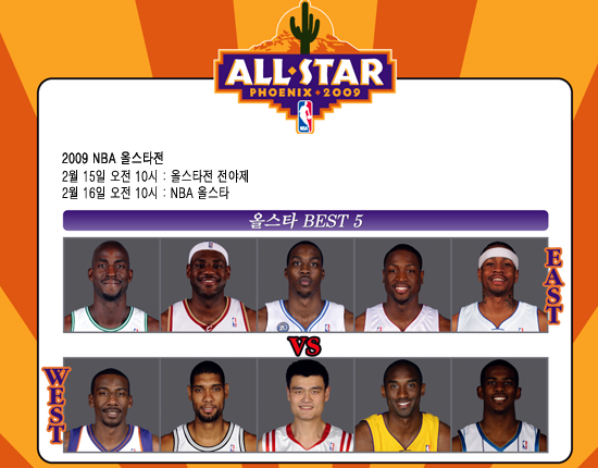 '별들의 잔치' 2009 미국프로농구(NBA) 올스타전(58회)이 16일 미국 애리조나주 피닉스 US 어웨이스 센터에서 벌어진다.