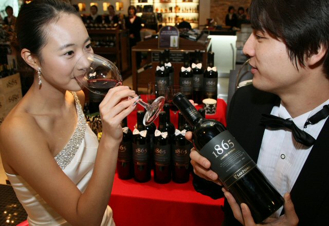 18일 오전 서울 롯데백화점 본점에서 모델들이 칠레 와인 '1865'의 프리미엄급 와인 '1865 리미티드 에디션(한정판)'을 선 보이고 있다.