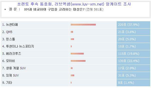 오늘 3월에 출시될 기아자동차의 쏘렌토 후속(프로젝트 명 XM)차의 경쟁 상대는 무엇일까? 쏘렌토 후속 동호회인 러브엑셈(www.luv-xm.net)은 회원들을 대상으로 최근 '쏘렌토 후속 차량 구입시 경쟁 구매 대상이 되는 차량은 무엇인가?'라는 설문조사를 실시했다.