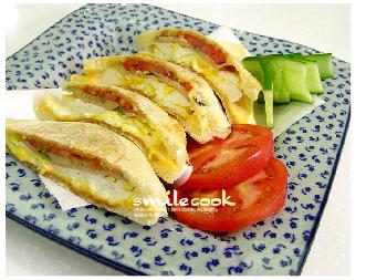 3. 차례차례로 속재료를 넣고 땅콩버터를 바른 식빵을 덮어 색나게 구우시면 됩니다.