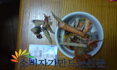 끓여 놓은 해물탕을 먹다 보니 꽃게의 집게다리가 썩어 냄새가 진동할 뿐 아니라 살이 검게 썩어 있었다.