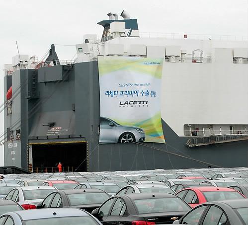 GM대우는 24일 군산공장 인근 자동차 전용 부두에서 유럽행 라세티 프리미어를 첫 선적하고 기념식을 열었다.
