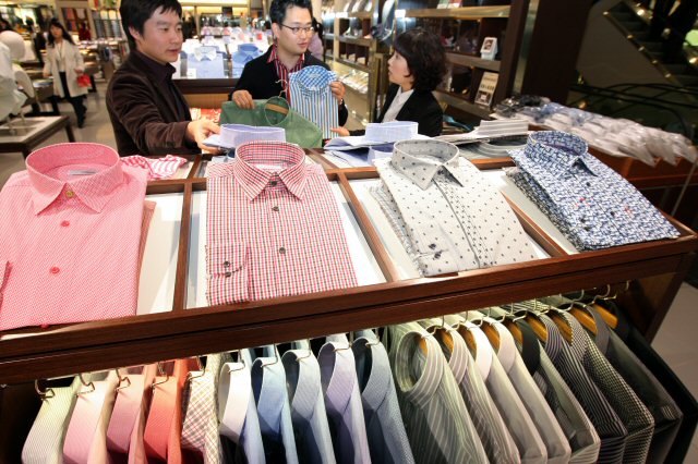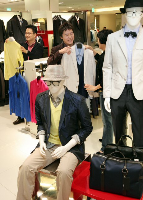 남성들의 패션 트랜드에 맞춰 백화점들도 '옴므(남성.Homme)' 라인을 강화하고 있는 가운데 25일 서울 신세계백화점에서 남성 고객들이 화사한 색의 셔츠를 고르고 있다. (사진=연합뉴스)