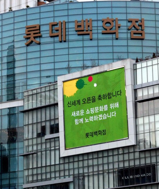 현수막은 가로 11.4m, 세로 10.6m 크기에 "신세계 오픈을 축하합니다. 새로운 쇼핑문화를 위해 함께 노력하겠습니다"는 내용을 담았다.