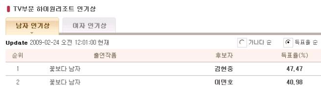 하지만 두 사람이 후보로 이름을 올린 작품은 다르다. 이민호는 '꽃보다 남자'로, 김범은 MBC '에덴의 동쪽'으로 각각 후보에 올랐다.