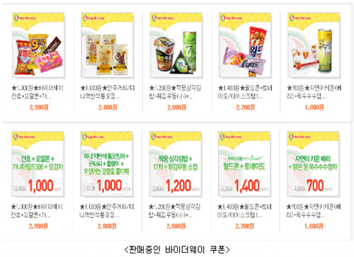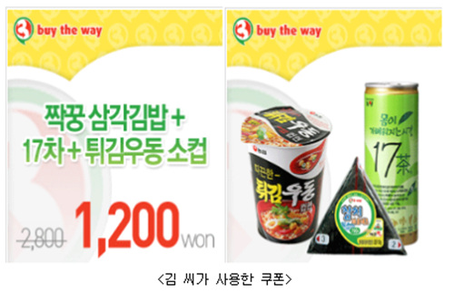대전 내동의 성 모(여. 23세)씨는 바이더웨이에서 '삼각 김밥, 튀김우동, 17차 캔음료'를 세트로 구입할 수 있는 쿠폰(1200원) 두 장을 G마켓에서 2400원에 구입해 약혼자에게 선물했다.