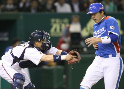 9일 오후 도쿄 도쿄돔에서 열린 월드베이스볼클래식(WBC) 아시아라운드 한국-일본 순위결정전 7회초 무사 2,3루에서 이대호의 땅볼 때 3루주자 김현수가 홈으로 파고들다 아웃되고 있다.