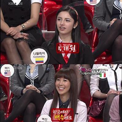 9일 방송된 KBS 2TV '미녀들의 수다'에서는 인기배우 김태희를 닮은 콜롬비아 출신의 나탈리아와 영어, 일본어, 프랑스어, 중국어, 대만어 등 7개 국어에 능통한 홍콩출신의 맥신이 출연했다.