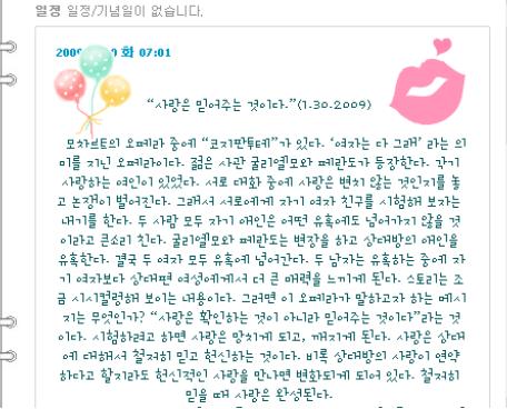 이 글은 모차르트의 오페라 중에 '코지판투테'를 인용한 글로 내용중 '사랑은 상대에 대해서 철저히 믿고 헌신하는 것이다. 비록 상대방의 사랑이 연약하다고 할지라도 헌신적인 사랑을 만나면 변화되게 되어 있다. 철저히 믿을 때 사랑은 완성된다.'는 대목이 특이나 눈길을 끈다.
