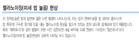 업체 담당자는 "예약취사 시 ‘멜라노이징 현상(미세 밥 눌음. 쌀알이 오랜 시간 침전되면 내 솥 바닥에 미세 전분이 가라앉아 발생)'이 나타나는 것이며 문제될 게 없다. 타사제품 또한 마찬가지“라고 답했다.