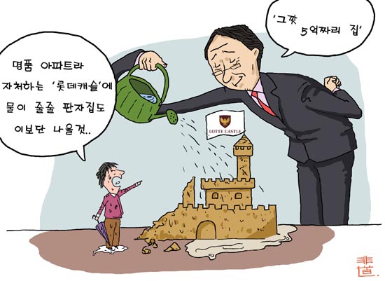 롯데건설의 '롯데캐슬'은 아파트 브랜드가 아니라 '판잣집'브랜드만도 못합니다. 판잣집도 새로 지으면 물이 새지 않습니다. 명색이 아파트인 데 온 집안이 물바다가 됐습니다"