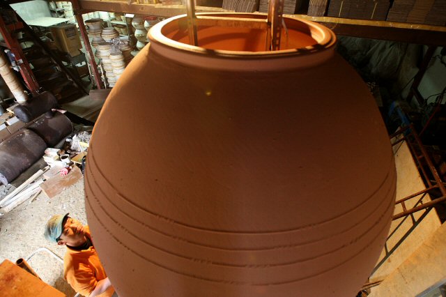 22일 울산시 울주군 외고산 옹기마을에서 옹기장인인 신재락(36)씨가 옹기장인인 아버지 신일성(67)씨와 두 동생 등 4부자를 포함해 모두 6명이 함께 만든 국내 최대 옹기를 살펴보고 있다.