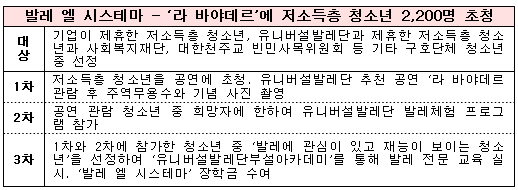 ‘구스타보 두다멜’은 베네수엘라 빈민층 소년이었으나 세계적인 지휘자로 성장한다. 그를 음악가로 키운 것은 빈민층 청소년에게 총 대신 악기를 들게 한 ‘엘 시스테마 (El Systema)’ 운동이다. 그가 이끄는 ‘시몬 볼리바르 유스 오케스트라(SBYO)’의 공연 이후, 두다멜과 ‘엘 시스테마’ 운동은 전세계 문화계의 핫 이슈였다. ‘엘 시스테마’ 운동은 빈곤에 찌든 저소득층 아이들에게 총 대신 악기를 쥐어주며 이들을 예술가의 길로 이끈 베네수엘라의 대안교육제도다. SBYO 역시 이 운동이 만들어낸 200여 개 오케스트라 중 하나이며, 두다멜은 이 대안교육을 통해 빈민층 아이에서 세계적인 지휘자로 성장한 음악가다.유니버설발레단은 ‘발레엘시스테마(Ballet El Systema, 저소득층 발레교육 시스템)’캠페인을펼친다. 저소득층 청소년을 공연에 초청하고, 희망자에 한해 발레단 탐방을 거쳐, 미래의 발레인을 꿈꾸는 재원을 찾아 그가 꿈을 이룰 때까지 발레 장학금 전액을 지원한다. 문훈숙단장은 “발레 엘 시스테마는 사회적 의미가 있고, 장기성 프로젝트입니다. 그렇기 때문에 이 프로젝트를 성사시키기 위해서는 많은 정성과 관심이 필요합니다. 이 뜻 깊은 프로젝트에 유니버설발레단과 함께 손잡을 기업체나 개인복지가가 계시다면 더욱 빛이 날 것 같습니다.” 라고 포부를 전했다. 현재 KB국민은행에서 1천만원을 기부하여 이 프로젝트의 첫번째 파트너가 되었다.