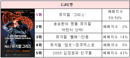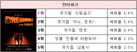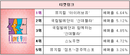 URL복사 기사공유하기 스크랩 프린트 메일보내기 글씨키우기 지난주에 1위를 차지했던 뮤지컬 ‘그리스’와 ‘드림걸즈’는 이번 주 공연랭킹 순위와 동일하다. 그 인기는 식을 줄 모르고 앞으로도 쭉 상승세를 보일 것으로 예상된다. 또한 뮤지컬 ‘아리러브유’ 새롭게 1위에 등극했다. 지난 주 1위를 차지했던 국립발레단의 ‘신데렐라’는 지속적인 관객들의 호응을 입으며 무난히 공연을 마쳤다. [뉴스테이지=편집부] 저작권자 © 소비자가 만드는 신문 무단전재 및 재배포 금지 뉴스테이지 제공 다른기사 보기 URL복사 기사공유하기 주요기사 삼성증권, 지난해 순이익 1조84억 원…주당 배당금 4000원 결의 [인사] 금융위원회 김동연 지사, 용인 반도체 현장 방문…"든든한 지원군이 되겠다" 에스티팜, 5600만 달러 규모 원료 공급계약 체결 KB금융, 1조 2000억 원 규모 자사주 861만 주 소각 보람의정부장례식장, 의정부성모병원과 MOU 체결...장례서비스 지원