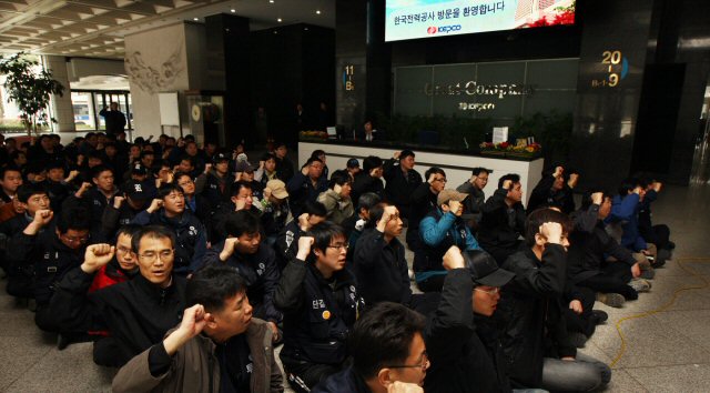 한국전력 노조원들이 30일 삼성동 한전 본사 로비에서 이사회의 인원감축 의결에 반대하는 집회를 하고 있다.