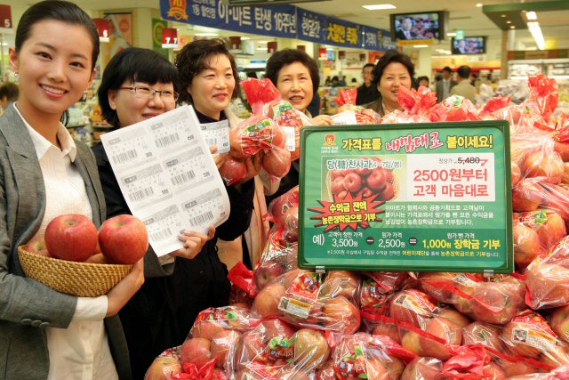 URL복사 기사공유하기 스크랩 프린트 메일보내기 글씨키우기 신세계 이마트가 2일부터 일주일간 정상가 5천4백80원인 '당(糖)찬사과'를 소비자가 원하는 가격대(하한선 2천500원)로 판매하는 행사를 연다. 고객이 2천500원 이상으로 구매할 경우 초과금액은 사과단지 농촌의 불우학생 장학금으로 기부될 예정이다. 1일 서울 이마트 용산역점에서 주부들이 행사품목인 '당(糖)찬사과'에 원하는 가격표를 붙이며 즐거워하고 있다.(사진=연합뉴스) 저작권자 © 소비자가 만드는 신문 무단전재 및 재배포 금지 유성용 기자 다른기사 보기 URL복사 기사공유하기 주요기사 삼성증권, 지난해 순이익 1조84억 원…주당 배당금 4000원 결의 [인사] 금융위원회 김동연 지사, 용인 반도체 현장 방문…"든든한 지원군이 되겠다" 에스티팜, 5600만 달러 규모 원료 공급계약 체결 KB금융, 1조 2000억 원 규모 자사주 861만 주 소각 보람의정부장례식장, 의정부성모병원과 MOU 체결...장례서비스 지원