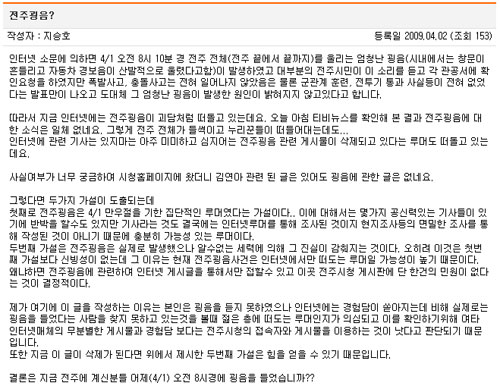 '전주굉음이 괴담처럼 떠돌고 있다'며 두 가지 가설을 내세운 네티즌의 글을 살펴보자.