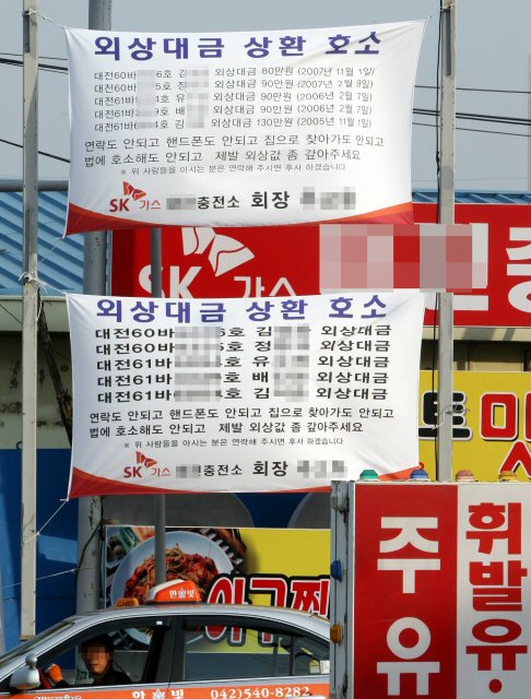 URL복사 기사공유하기 스크랩 프린트 메일보내기 글씨키우기 "전화도 안 받고 집으로 찾아 가도 안되고 법에 호소해도 안되고..." 2일 대전 중구의 한 LPG 충전소 입구에 외상값 상환을 호소하는 현수막이 내걸려 눈길을 끌고 있다. 현수막에 이름이 올라간 다섯 명은 모두 택시 운전기사로 추정되며, 이들이 밀린 외상값은 480여만원에 달한다.(사진=연합뉴스) 저작권자 © 소비자가 만드는 신문 무단전재 및 재배포 금지 이경환 기자 다른기사 보기 URL복사 기사공유하기 주요기사 흰색 패브릭 소파 변색됐는데...'자연스런 현상'이라며 무상AS 거부 김동연 지사 "북오산IC 진입로 3차선으로 늘려 체증 해소" 삼성증권, 지난해 순이익 1조84억 원…주당 배당금 4000원 결의 [인사] 금융위원회 김동연 지사, 용인 반도체 현장 방문…"든든한 지원군이 되겠다" 에스티팜, 5600만 달러 규모 원료 공급계약 체결