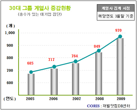 3일 재계 전문 사이트 재벌닷컴이 총수가 있는 30대그룹(자산총액 순위)의 연도별 계열사 변동현황을 집계한 결과 2009년 3월 말 현재 30대그룹의 전체 계열사 수는 970개로 나타났다.