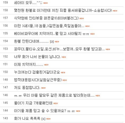 이 외에도 게시판 곳곳에서 석면 베이비파우더로 인한 소비자들의 애타는 마음과, 소송도 불사 하겠다는 게시글이 줄을 잇고 있었다.