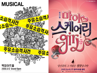 올해도 변함없이 무비컬로 공연되는 작품들이 속속 등장했다. 그 중 ‘주유소 습격사건’과 ‘마이 스케어리 걸’을 꼽을 수 있다. 이 작품들은 창작 뮤지컬로 올해 처음 선보이며 현재 인기몰이에 한창이다. ‘주유소 습격사건’은 지난 1999년 영화로 개봉되어 260만 명의 흥행기록을 수립한 바 있다. 이번 뮤지컬에서는 영화 ‘주유소 습격사건’의 원년멤버인 손무현 음악감독과 박정우 작가가 참여하여 화제가 됐다. 뮤지컬 ‘주유소 습격사건’은 오는 6월 14일까지 백암아트홀에서 공연된다. 또한 ‘마이 스케어리 걸’은 2006년 최고의 흥행영화 ‘달콤, 살벌한 연인’을 원작으로 한 뮤지컬이다. 당시 이 영화는 저렴한 제작비에도 불구하고 독특한 캐릭터와 아이러니한 상황, 기발한 극 전개로 영화 관객들의 폭발적인 호응을 얻었다. 뮤지컬 ‘마이 스케어리 걸’은 원작의 유니크하고 범상치 않은 캐릭터와 엉뚱하게 전개되는 극의 매력을 그대로 살리면서 더욱 스피디한 장면을 연출했다. 이 작품은 오는 5월 17일까지 충무아트홀 소극장 블랙에서 공연된다.