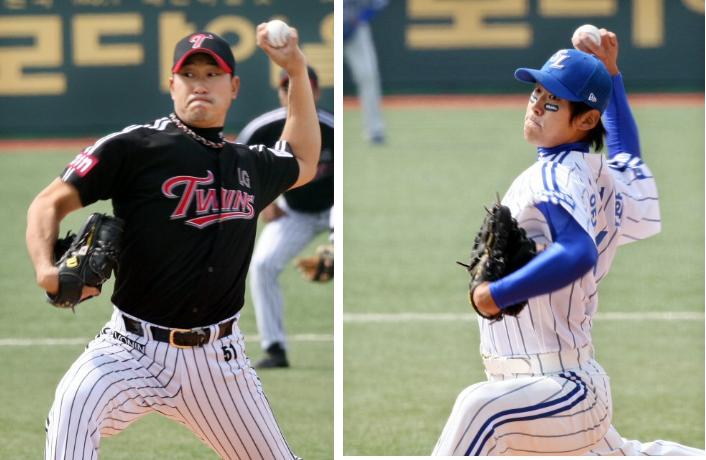 LG 선발투수 봉중근과 삼성 선발투수 윤성환이 4일 대구구장에서 열린 프로야구 삼성 라이온즈-LG 트윈스전에서 힘차게 공을 던지고 있다.