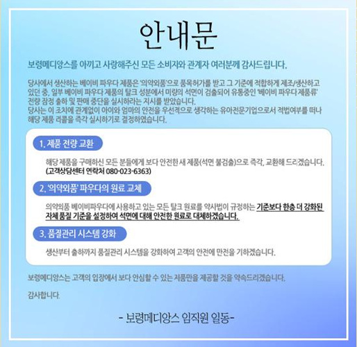 이에 대해 보령메디앙스 관계자는 "석면 파동의 대처에 관한 문의가 많았기에 소비자들에게 이 상황을 빨리 알려야한다는 일념으로 급히 '안내문'으로 공지가 됐었다"며 "이 후 소비자들의 '사과' 지적을 받아들여 '사과문'으로 변경 고지했다"고 해명했다.