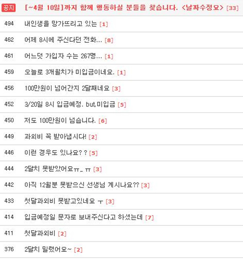 현재 소비자가 만드는 신문 취재팀이 확인한 결과 수업료를 받지 못한 과외선생님과 과외비 환불이 지연되는 학생들의 수가 300여 명에 달하는 것으로 알려지고 있다.