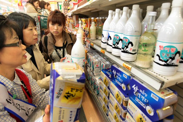 6일 롯데마트 서울역점에서 일본 관광객들이 다양한 종류의 막걸리를 살펴보고 있다.