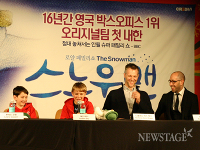 하워드 블레이크의 감미로운 피아노 연주로 시작한 이번 기자간담회는 질의응답시간과 포토타임으로 이루어졌다. 하워드 블레이크는 “한국에서 공연을 할 수 있어 매우 기쁘다”며 “이번 공연에는 특별히 눈사람 중 하나를 한국의 전통 모자를 씌워 한국 공연을 기념했다”고 밝혔다. 또한 ‘스노우맨’의 하이라이트 장면인 하늘을 나는 장면의 소감을 묻는 기자의 질문에 소년 역의 루이스 코펜은 “높이가 생각보다 굉장하다. 내가 그렇게 까지 높이 떠 있다니 정말 나는 기분이 든다”며 천진하게 대답했다. 또다른 소년 역의 애던 데이는 같은 질문에 “하늘을 나는 장면은 마치 마술과 같다. 공중에 떠서 날아가고 있으면 구경온 다른 아이들이 웃는 모습을 볼 수 있다. 모두 즐거운 장면이다”라고 대답했다.