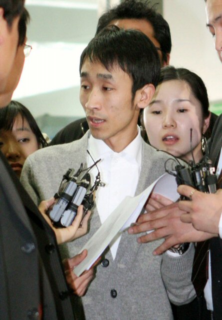 8일 오후 유장호 호야스포테인먼트 대표가 장자연씨 자살 사건과 관련, 조사받기 위해 경기도 성남 분당경찰서에 출석해 취재진에게 준비해 온 보도자료를 나눠주고 있다.