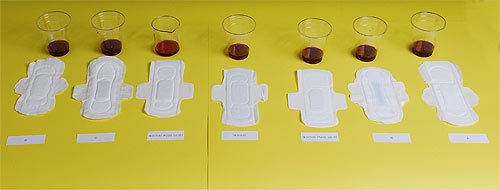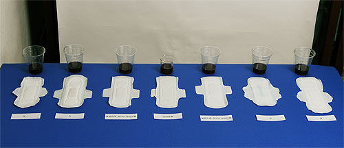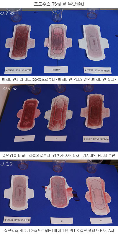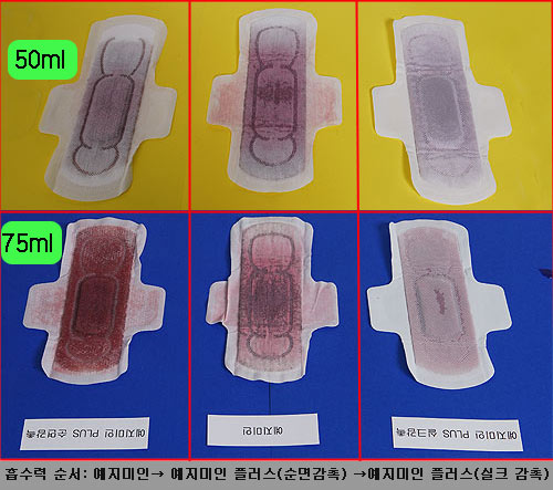 실험방법은 체온 수준으로 뎁힌 따뜻한 포도주스 50ml를 각각의 제품에 서서히 흡수시켰다. 여성들의 생리혈은 사람에 따라 모두 다르지만 하루 평균