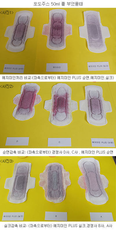 흡수력의 진화도 두드러진다. 포도주스 실험결과 흡수력 순서를 꼽는다면 예지미인→ 예지미인 플러스(순면감촉) →예지미인 플러스(실크 감촉)의 순.
