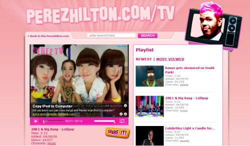 한편 페레즈힐튼닷컴은 지난해 9월 원더걸스의 '소핫'(So Hot)과 이효리 '유고걸'(U Go Girl)이 소개되어 화제가 된 바 있다.(사진-페레즈힐튼닷컴사이트)