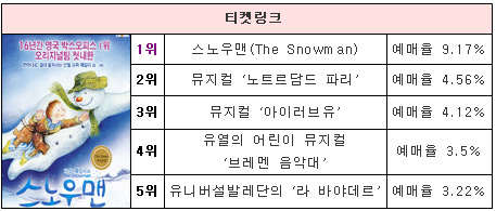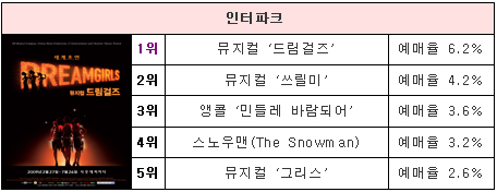 URL복사 기사공유하기 스크랩 프린트 메일보내기 글씨키우기 이번 주는 성인극 ‘룸넘버13’과 ‘스노우맨’이 새롭게 올라왔다. 그 가운데 유독 뮤지컬 ‘드림걸즈’만이 꾸준한 1위를 지키고 있다. 특히 ‘스노우맨’은 인터파크에서는 4위, 티켓링크에서는 1위를 거머쥐며 활기찬 행진을 시작했다. 봄볕이 따사롭고 향긋한 4월, 앞으로 어떤 공연들이 관객들의 사랑을 얻게 될지 점점 궁금해진다. [뉴스테이지=편집부] 저작권자 © 소비자가 만드는 신문 무단전재 및 재배포 금지 뉴스관리자 다른기사 보기 URL복사 기사공유하기 주요기사 LG전자, ISE 2026서 ‘LG 매그니트’ 공개…설치·운영 편의성 강화 정진완 우리은행장 “올해 경쟁은행과의 격차 줄이겠다” 하나금융, 올해 생산적 금융에 17.8조 공급한다 이재용 "숫자에 취하지 말라"…임원들에 '마지막 기회' 강조 흰색 패브릭 소파 변색됐는데...'자연스런 현상'이라며 무상AS 거부 김동연 지사 "북오산IC 진입로 3차선으로 늘려 체증 해소"