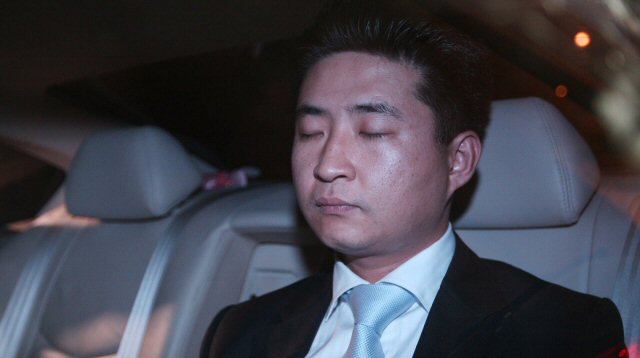노무현 전 대통령의 아들 건호씨가 검찰 조사를 마치고 12일 밤 서울 서초동 대검찰청을 떠나고 있다. 마라톤 조사 뒤 피곤하 듯 눈을 감고 있다.