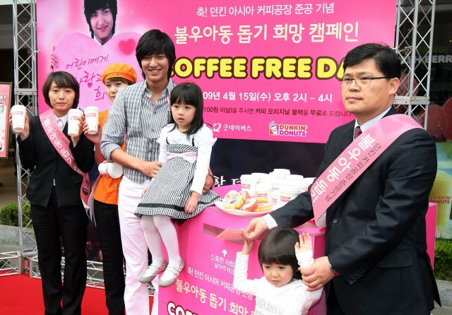 14일 서울 강남 던킨도너츠 본점에서 열린 이민호와 함께하는 던킨 커피 프리데이 행사에서 던킨의 새로운 모델인 탤런트 이민호가 아이들과 함께 프리데 이 모금함에 기부금을 넣고 있다.
