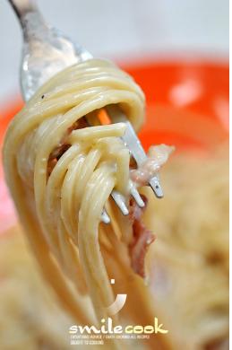 베이컨이나 햄을 넣고 달걀로 농도를 맞추는 까르보나라 스파게티는 고소한 맛이 좋습니다. 달걀이 익지 않도록 재빨리 섞어주는 법만 익히면 쉽게 까르보나라를 만들 수 있습니다. (제공=스마일쿡.www.smilecook.co.kr)
