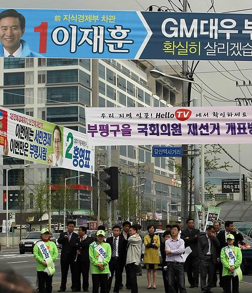 4.29 재보선 최대 격전지로 꼽히는 인천 부평을은 한나라당 이재훈, 민주당 홍영표, 민주노동당 김응호, 무소속 천명수 후보가 출전한 가운데 한나라당과 민주당 후보와의 초접전의 승부를 펼치고 있다.