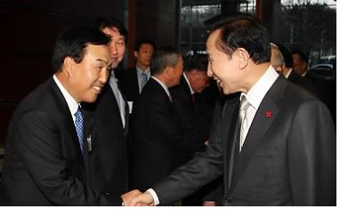 만약 이 전 부회장의 영입이 성사되면 KT로서는 SK텔레콤을 따라 잡을 수 있는 실질적인 '빅 카드'를 확보하는 셈이어서 통신시장의 지각변동이 주목되고 있다.<사진=연합뉴스,이기태 전 부회장이 (왼쪽)이명박 대통령과 악수하고 있다>