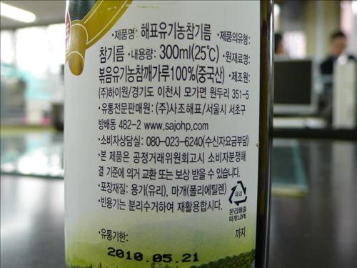 문제의 참기름은 경기도 이천시 소재 ㈜하이원이 제조하고 ㈜사조해표가 판매한 것으로, 회수 대상은 유통기한이 '2010.05.21'로 표시된 제품이다.