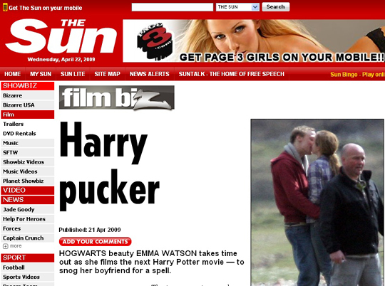 영국 현지 언론은 영화 '해리포터 죽음의 성물' 촬영 중인 왓슨이 지난 18일(현지시간) 영화 촬영장에 8세 연상의 남자친구를 초대했다고 보도했다.
