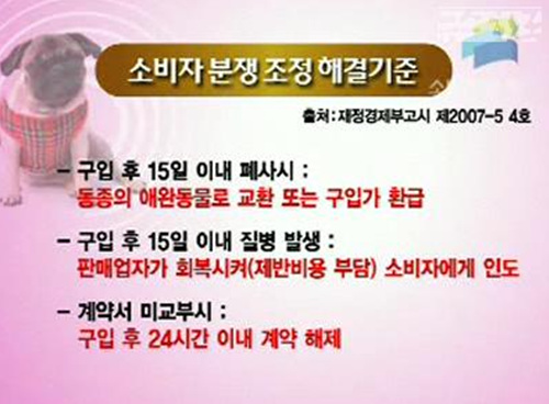 애완견 판매업 관련 소비자피해보상규정에 따르면 구입 후 15일 이내 폐사할 경우 같은 종류의 애완견으로 교환 및 환불해 주도록 돼 있지만 애견샵 측은 이를 무시한 것.