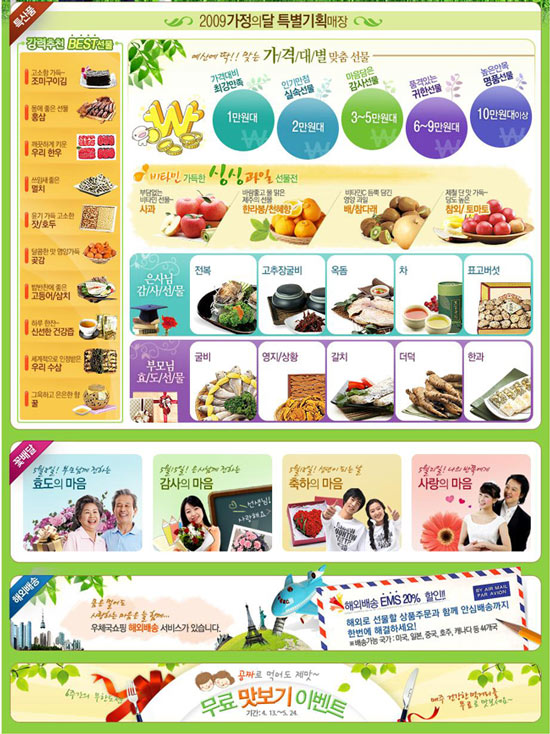 김, 해산물 세트 등 1~2만원대 실속형 선물과 품격까지 챙길 수 있는 2~3만원대 녹차, 꿀, 민속주 등을 비롯 시중보다 저렴한 가격에 품질까지 만족할 수 있는 홍삼제품, 영지버섯, 전복, 갈비, 굴비 등 다양한 특산품들을 준비했다.