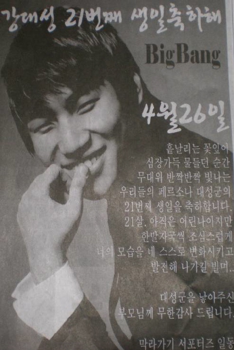 빅뱅의 팬들로부터 일간지 지면 광고로 생일 축하를 받은 것.