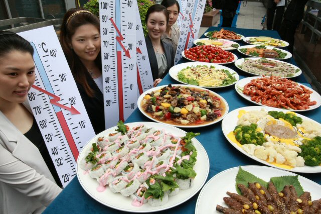 지구 온난화 해결을 위한 'Save Our Earth Conference2009'가 26일 서울 강남구 센트럴시티 밀레니엄홀에서 열렸다.여성들이 채식요리와 함께 가상온도계를 보여주고 있다.