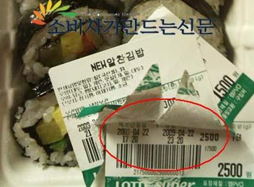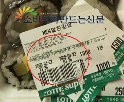 김 씨는 사 온 김밥의 포장을 벗기던 중 가격 표가 3중으로 부착된 것을 보고 호기심에 하나씩 떼 보았다. 그러자 17시20분이었던 제조일시가 할인 스티커를 다시 부착하면서 21시36분으로 바뀐 것을 발견했다. 유통기한 또한 22일 23시20분에서 23일 03시36분으로 변경돼 있었다.