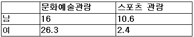 <표1>에서 남성과 여성이 각자 선호하는 여가향유의 방안이 확연이 대비됨을 확인할 수 있다. 남성이 스포츠 관람과 같은 현장문화에 열광하는데 비하여 여성은 문화예술관람과 같은 공연문화에 훨씬 더 큰 선호도를 둔다. <그림1>의 오른쪽 원형 그래프는 인터파크 티켓에서 자체 집계한 공연 구매자 성별분포이다. 실제 티켓구매에 있어서도 여성이 압도적인 우위를 차지한다는 것을 알 수 있다.