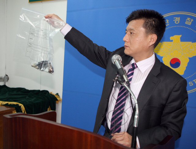 이 사고로 이씨가 병원 치료 중 숨졌으며 조 경위는 중태에 빠졌다. 군산경찰서 수사과장이 범행에 사용된 권총을 들어보이고 있다.
